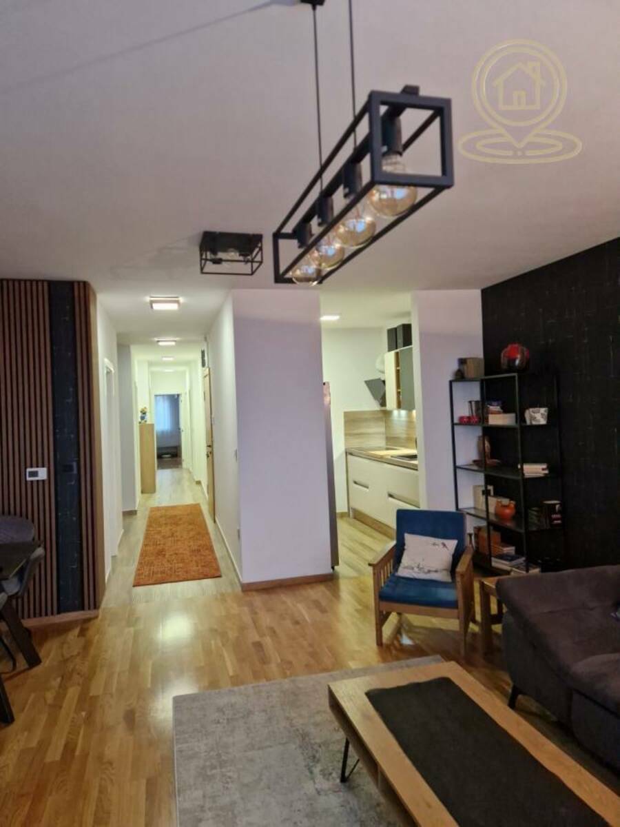 Stan je nov, savremeno projektovan i dvostrano orijentisan, sa lepim pogledom i dosta prirodnog svetla. Funkcionalan raspored čine prostrana dnevna soba sa trpezarijom i kuhinjom, spavaća soba, dve dečije sobe, dva kupatila, kao i dve terase od kojih jedna poseduje ostavu.
