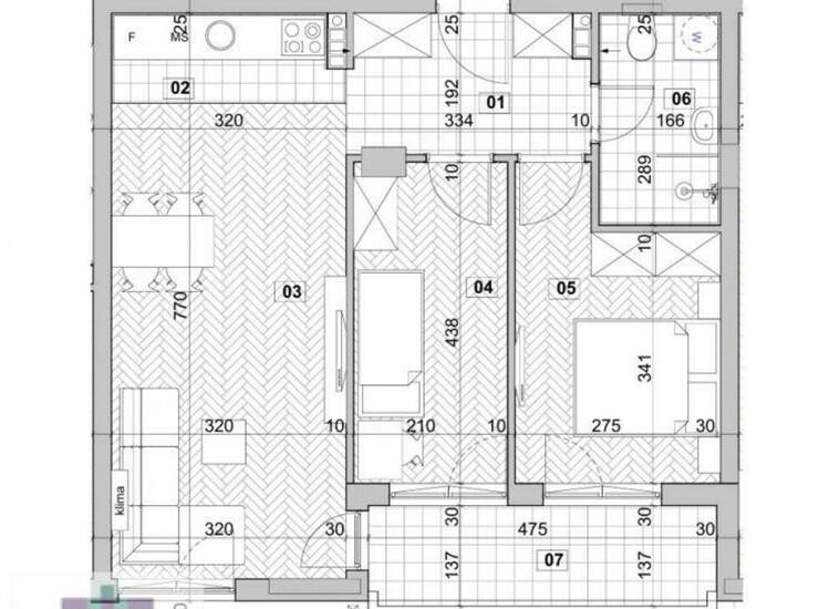 Stan 59.61m² se nalazi na prvom spratu i sastoji se iz hodnika, dnevne sobe sa kuhinjom i trpezarijom, 2 spavaće sobe, kupatila i terase.