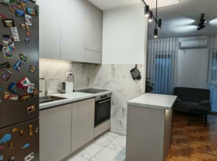 Stan ima površinu 42 m2 i nalazi se na prvom spratu. Uknjižen je 1/1 i prodaje se kompletno namešten kao na fotografijama, osim TV-a, dušeka i kreveca. Sav nameštaj i ugradni elementi kupljeni su novi pre 12–18 meseci i uključeni su u cenu.