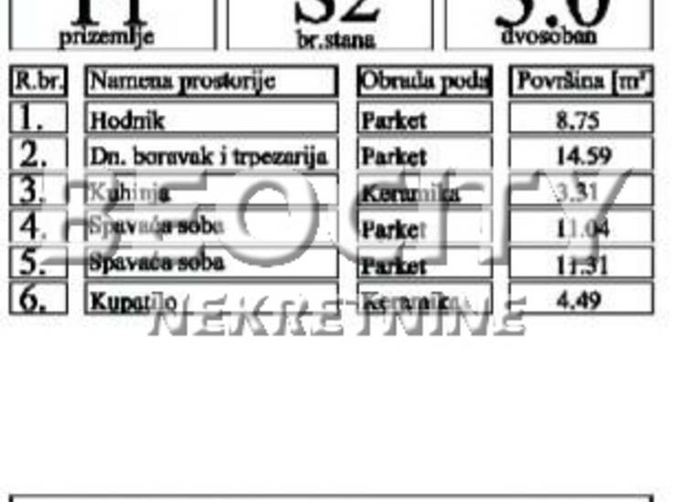 Agencijski ID: 117007, VPR/IV, lift, ulaz mermerni, novogradnja. Prodaje se stan 53,49 m2, na Novoj Detelinari. Povrat PDV. Odlican na visokom prizemlju, veoma visoko, 8 stepenika od nivoa zemlje. Odlicna povezanost sa centrom grada, fakultetima. Blizina Sajma. 2 spavace sobe. Iz dnevne sobe, koja gleda ka dvoristu okrenuta ISTOKU - izlaz na francuski balkon. Velika kuhinja. Stan dvostrano orjentisan sa dosta svetla. Kupatilo prostrano ima mali prozor u vrhu. Podovi: toplotna i zvucna i hidroizolacija uradjeni. Parket: uvoz iz Svedske 120x30 cm. Pregradni zidovi 25 cm, termoblok. Visina zidova 2,70 m. Klima. Grejanje centralno. U stanu termostat za podesavanje temperature. Aluminijumske roletne. Agent je video stan. Stan za preporuku. Parking je javni i ima dovoljno mesta. Pouzdan investitor. Gradnja po dobijenim medjunarodnim sertifikatima ISO14001, ISO 45001, ISO 9001, sto garantuje maksimalnu udobnost i sigurnost zivljenja. Moguce je napraviti terasu! Moguc kredit. Vise informacija na: www.beocitynekretnine.rs Agencijska provizija 3%. Telefoni: 021/399-0210 060/399-... Prikaži broj . Kontakt van radnog vremena: kancelarija@beocitynekretnine.rs