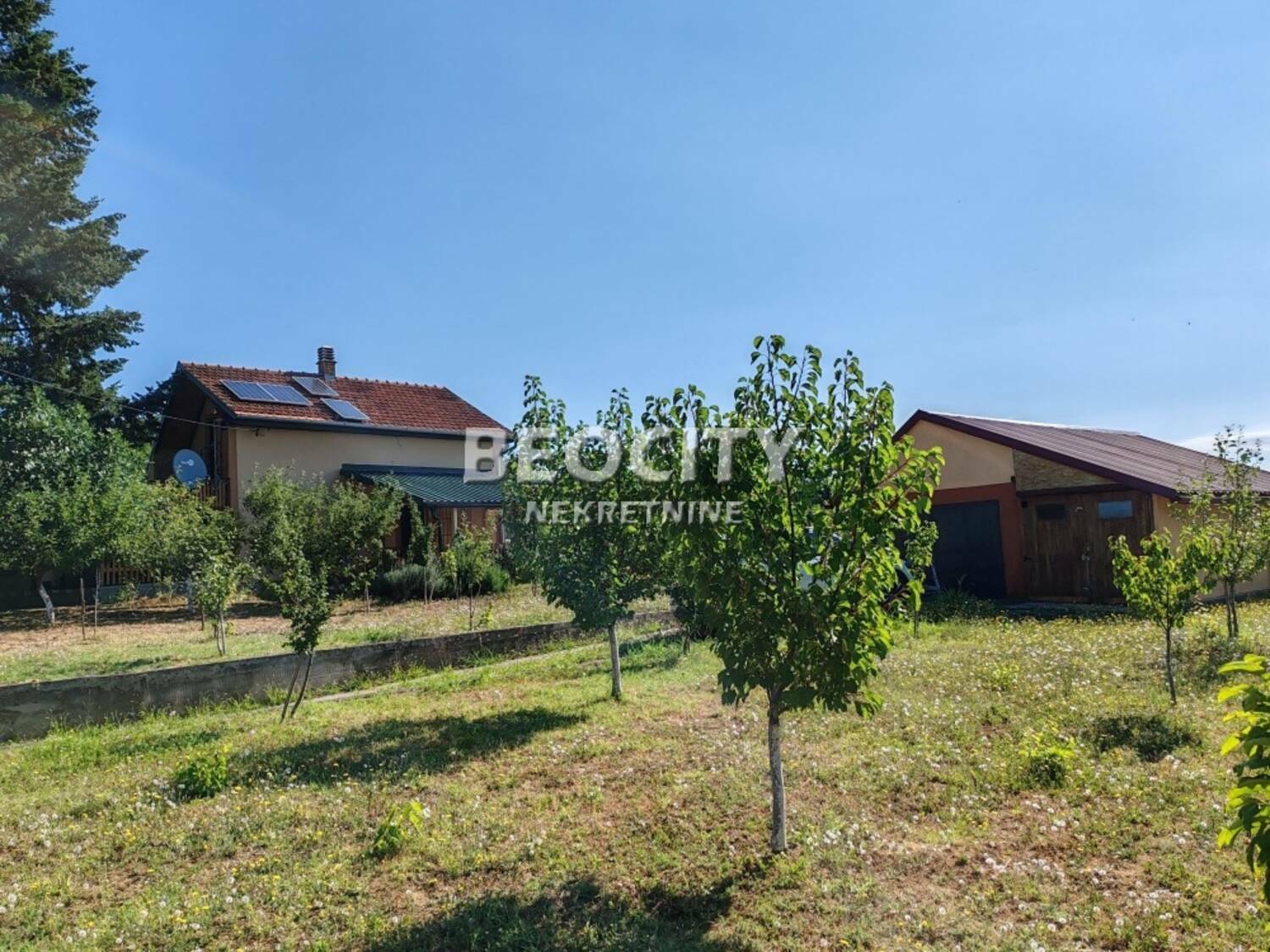 Kuca sa dve garaze i dve velike natkrivene terase, ima korisnih vise od. 120m2 vrlo lepo uredjenog stambenog prostora. Smestena na 23 ara placa, u ulici na asfaltu, ova kuca pleni velikim i zanimljivim dvoristem, sa dva velika cetinara i orahom na ulazu, sa cesmom, puno mladog voca, nesto starijih sadnica, puno dekorativnog zelenila i dovoljno mesta za jedan ili nekoliko auta.