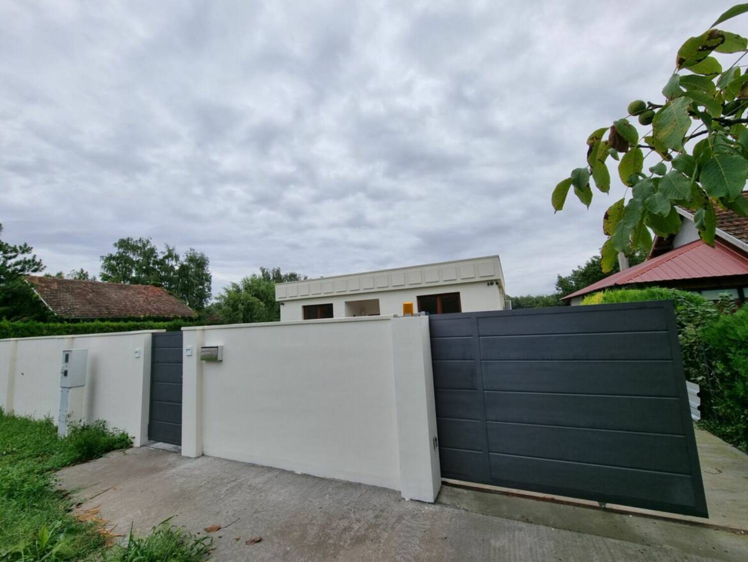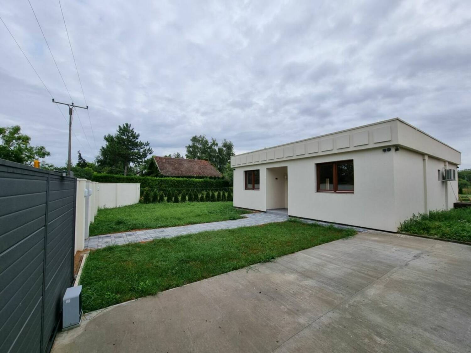 Ograda - sa prednje, ulazne strane nalazi se moderna zidana, betonska ograda. Moderna ulazna kapija, garažno mesto za 1 auto i klizna, automatska kapija (otvaranje na daljinski). Ostatak placa oivičen je zelenom zimzelenom ogradom - smaragd tujama.