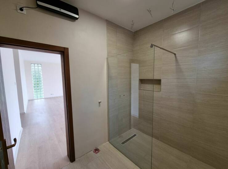 Kupatilo - tuš kabina (staklena pregrada). Ostala oprema - sanitarije predviđene da odabere budući vlasnik, a sve instalacije su tu.
