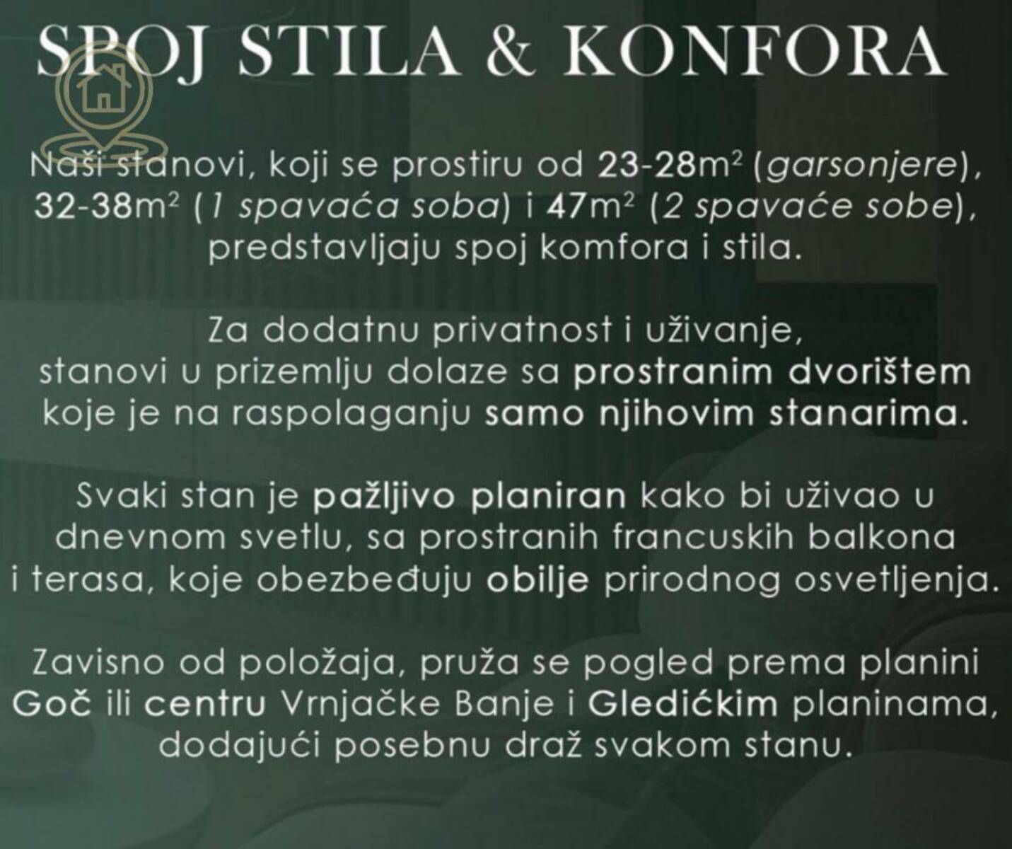 U ponudi je moderan i kvalitetno opremljen stambeni kompleks u samom centru Vrnjačke Banje, jednom od najpoznatijih turističkih centara Srbije. Objekat je u završnoj fazi izgradnje (80%) i biće useljiv do kraja godine. Kupovina je moguća i putem stambenog kredita, što ovu ponudu čini još dostupnijom.