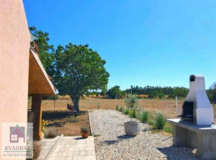 Vikendica poseduje natkrivenu terasu, bazen, uređeno dvorište i prostor za druženje na otvorenom.